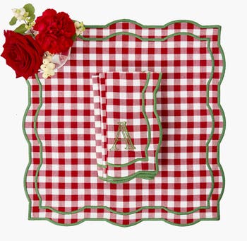 Add a dash of cheer to every course with Felix Red and Green Gingham Napkins. The classic gingham pattern in vibrant holiday hues brings festive charm and joyful style to Christmas table settings. Perfect for seasonal dining decor, coordinating with placemats, and making holiday meals feel extra special. We offer the option to personalise your napkins with our Mrs. Alice monogram service. To add a monogram, enter up to 2 letters and select your preferred font. If no font is chosen, we will use the Devonshire font. Please allow an additional 6 to 10 days from the time of your order for monogramming.