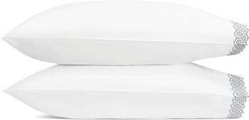 Two-color embroidery in an interlocking honeycomb motif brings an artisanal look to these pillowcases cut from luxuriously smooth Egyptian-cotton percale.