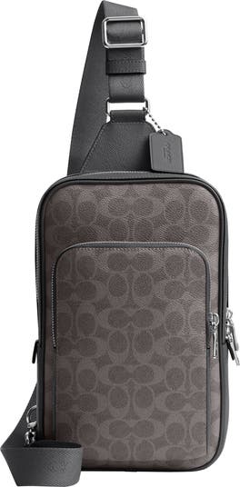 A logo monogram pattern provides an eye-catching contrast to the smooth, rich leather of this slim sling bag featuring multiple pockets and a convertible strap for on-the-go convenience.