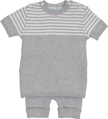The soft-ribbed knit feels good on baby's skin in this striped cotton top and shorts set with genuine mother-of-pearl buttons on the shoulders.