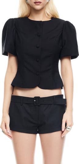 Puff sleeves and princess seams shape the silhouette of this cropped front-button shirt.