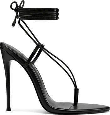 The XIV Sandal features a daring spaghetti micro thong vamp and delicate straps, designed for those who prioritize the look over everything. Handcrafted in LA with a open-pointed toe, extreme minimalist lace up, and self-covered stiletto heel at 4.75 inches. Vegan upper Vegan Insole Leather / Rubber formulated outsole Open-Pointed toe Lace - Up Handmade Designed in LA Self-covered stiletto heel, 4.75" (120mm)
