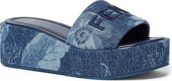 Logo detailing tops the wide strap of this slide sandal featuring a cushioned footbed and a rubber-treaded platform sole.