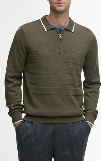 Tactile, textured stripes loom from the cotton-and-wool background of this long-sleeve polo that fastens with a zip placket giving the classic style a sporty stance.