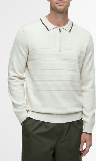 Tactile, textured stripes loom from the wool-and-cotton background of this long-sleeve polo that fastens with a zip placket giving the classic style a sporty stance.