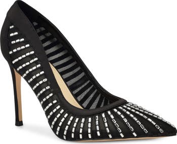 Jewel-embellished columns illuminate the mesh upper of a glamorous pump featuring a pointy toe and svelte stiletto heel for soirée-ready balance.