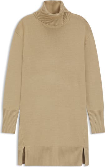Dropped shoulders enhance the relaxed silhouette of this soft virgin-wool-blend sweater-dress knit with a cozy turtleneck and anchored by ribbed trim.
