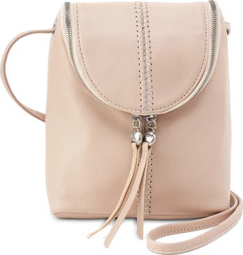 Decorative stitching and brushed hardware highlight the richly grained leather of a compact crossbody bag fitted with ample pockets for storing your smaller essentials while on the go.