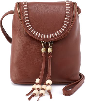 Decorative stitching and brushed hardware highlight the richly grained leather of a compact crossbody bag fitted with ample pockets for storing your smaller essentials while on the go.