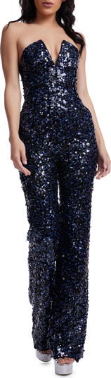 An architectural, strapless neckline lets you show off your shoulders in this lustrous sequin jumpsuit that brings a modern look to party attire.