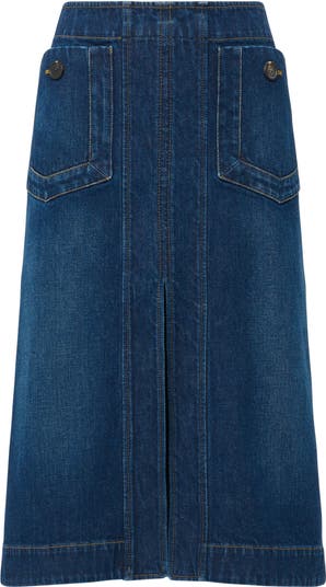 The Fernanda knee length skirt is made from a mid-weight Italian stretch denim that has been garment washed. With a side seam zipper opening, and featuring two buttoned front patch pockets. with a slight a-line silhouette and front slit. FREE SHIPPING AND DUTIES PAID IN THE USA AND EUROPE (EU).