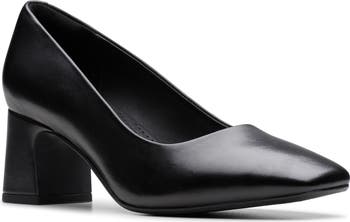 A classic square toe defines this smooth leather pump set on a sturdy block heal and cushioned by a contoured footbed for lasting comfort.