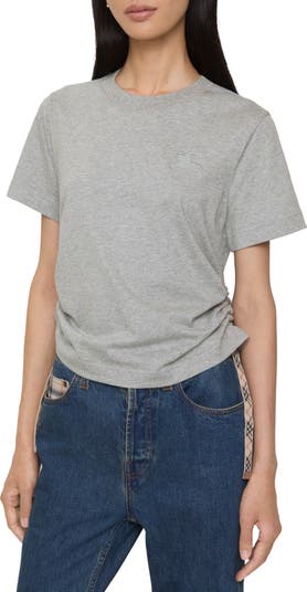 A T-shirt in lightweight cotton jersey, cut to a regular fit and embroidered with a tonal Equestrian Knight Design. The ruched sides can be adjusted with the Burberry Check side straps and B buckles.||Rib-knit neckline|Embroidered Equestrian Knight Design at chest