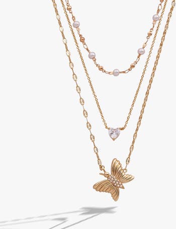Effortless layered elegance meets festival vibes. This three-strand necklace features shiny gold with clear crystal pavé and white pearls—no styling guesswork required. The shortest strand showcases rosary-linked pearl beads, the middle strand pairs a delicate cable chain with a bezel-set crystal heart pendant, and the longest strand features a faceted lip chain topped with a fluted butterfly adorned with pavé detailing. Pre-layered for instant boho-chic impact, or mix-and-match to your preference!