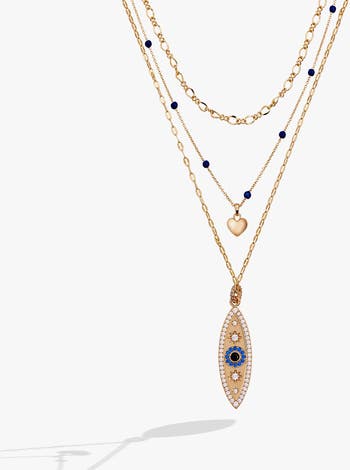 Effortless layering meets boho spirit. This three-strand necklace features shiny gold with sapphire, jet, and clear crystal stones—no guesswork required. The shortest strand showcases a delicate figaro chain, the middle features a blue enameled station chain with a puffy heart mini pendant, and the longest displays a faceted lip chain topped with a pavé evil eye pendant. Pre-layered and ready to wear, it's your instant festival-ready look, or mix-and-match to your preference!