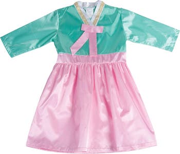 3 - 5 years. This detailed, silk-styled dress represents the traditional clothing of Korea. It is called a hanbok. Hook-and-loop closures allow children to practice dressing and undressing, encouraging independence. Celebrate all the traditions of Korea and their rich history by adding books, food, crafts, and props to dramatic play and throughout the classroom. Made of soft, 100% polyester machine-washable fabric.