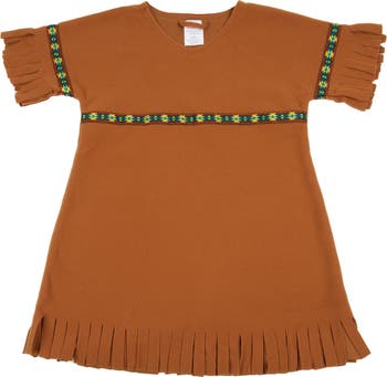 3 - 5 years. Representing the traditional clothing of the Native American girl, this dress features fringed sleeves and stylistic designs to mimic deer hide clothing. The pullover dress allows children to practice dressing and undressing, encouraging independence. Add additional Native American materials, along with this dress, to encourage children to learn more about our Native American tribes and their rich histories. Made of soft, 100% polyester machine-washable fabric.