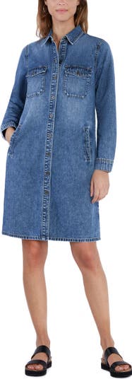 Keep it cool and classic in this denim dress designed with antique-brass buttons and handy pockets.