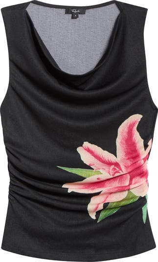 A lone lily brightens a graceful cowl neck tank shaped by gentle ruching at the sides.