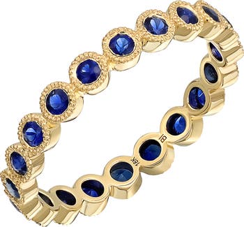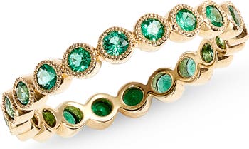 Milgrain bezels twinkle softly around vivid round emeralds on this stacking eternity band handcrafted from 18-karat gold.