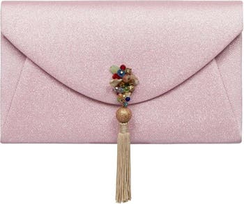 The Feyi clutch is an oversized envelope shaped clutch, made of a shimmer fabric. It is centred with a gold tassel ornament - decorated in beads. The ornament is uniquely hand crafted and may differ in each bag.