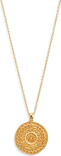 A delicate chain necklace plated in 18-karat gold is centered by an intricately detailed pendant inspired by traditional mandalas.