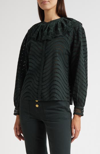 Airy embroidered eyelets bring breathable charm to this breezy cotton top made with a frilled scallop-trimmed collar.