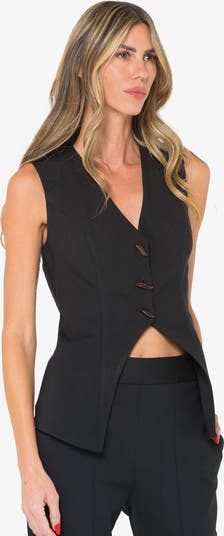 Tailored women’s vest in luxe micro-modal with deep V-neckline, tortoise buttons, sculpted waist & cutaway hem. Sleeveless, USA-made resortwear by JBQ.
