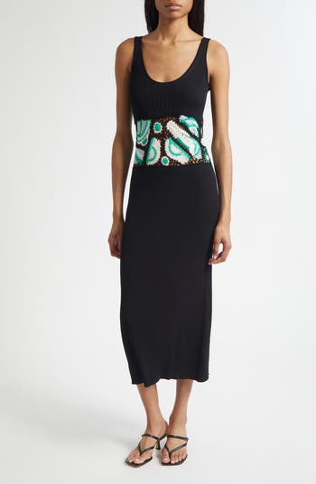 A colorful crochet panel adds texture and sophistication to this rib-knit sleeveless dress.
