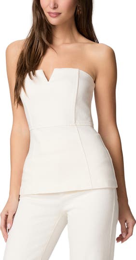 Shapely seams further the fitted silhouette of this strapless top made from stretch-kissed denim and detailed with a notched neckline.