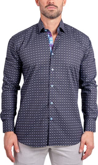 Turn heads in the eye-catching print of this subtly lustrous sport shirt made from breathable cotton in a fit that's right in between trim and regular.