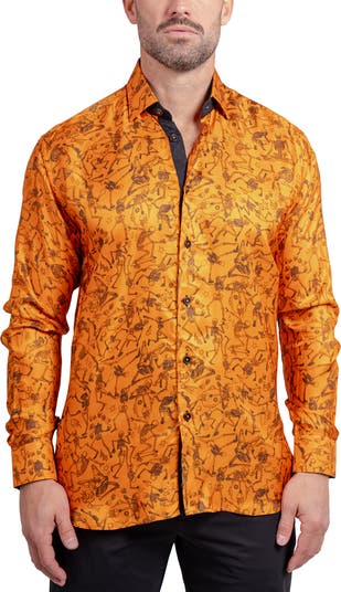Turn heads in the eye-catching print of this subtly lustrous sport shirt made from breathable stretch cotton in a fit that's right in between trim and regular.