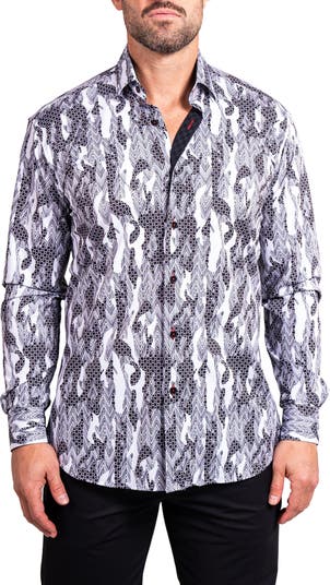 Turn heads in the eye-catching print of this subtly lustrous sport shirt made from breathable stretch fabric in a fit that's right in between trim and regular.
