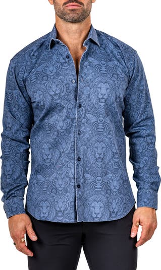 Turn heads in the eye-catching print of this sport shirt made from a breathable cotton blend in a fit that's right in between trim and regular.