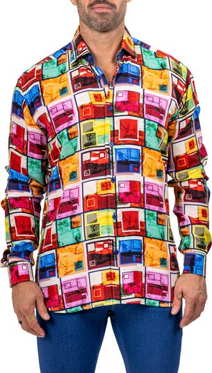 Turn heads in this eye-catching sport shirt made from breathable, subtly lustrous Italian fabric in a fit that's in between trim and regular.