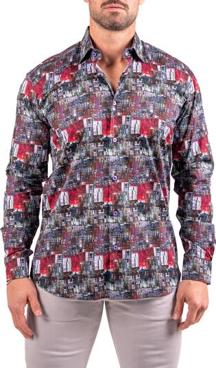 Turn heads in the eye-catching abstract print of this button-up shirt made from breathable cotton in a fit that's right in between trim and regular.