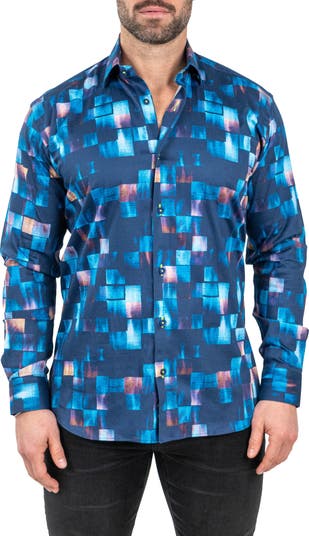 Turn heads in the eye-catching print of this button-up shirt made from breathable, odor-resistant Italian cotton in a fit that's right in between trim and regular.