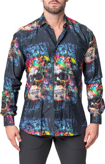 Maceoo Fibonacci Skull Regular Fit Cotton Blend Button-Up Shirt, Main, color, Blue