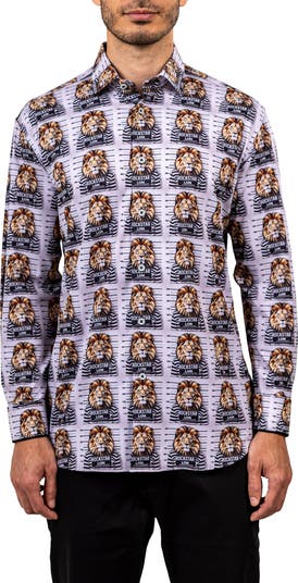 Fierce lions make a bold statement on this eye-catching sport shirt cut from breathable stretch fabric in a fit that's right in between trim and regular.