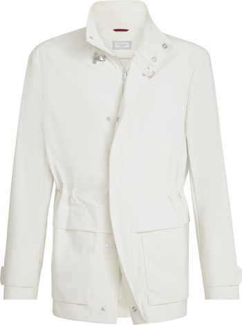 - Double closure with zip and snapsCollar may be worn raisedSnaps at cuffsPatch hand pockets with flapUnlinedTwo interior pockets with button and pen holderDrawstring waistDouble back vent with buttons