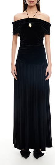 A draped, shoulder-baring neckline dials up the sultry appeal of this velvet maxi dress cut with a floor-sweeping skirt for added drama.