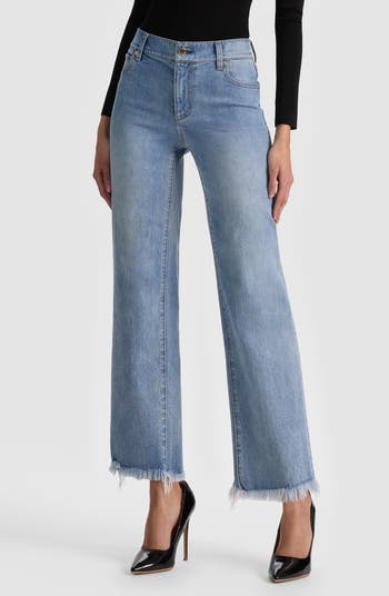 Made with raw hems and slim-cut straight legs, these mid-rise jeans offer casual-cool comfort with faded low-stretch denim.