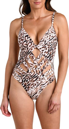 A wild animal print gives you fierce poolside style in a strappy one-piece swimsuit with moderate back coverage.