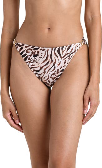 An eye-catching animal print makes a bold statement on cheeky low-rise bikini bottoms.