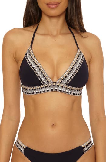 A colorful basket weave design trims this bikini top complete with adjustable ties for a personalized fit.