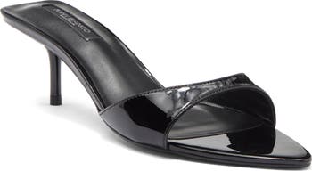 A dainty heel adds just-right height to a glossy patent-leather sandal featuring an elegantly curved strap.