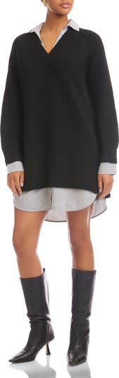 A soft raglan-sleeve sweater-dress is made with striped poplin accents for a polished layered look.