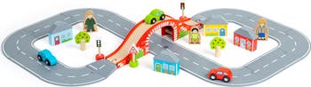 A fun twist on our best-selling wooden roadway set! Petite petrol heads will go car-azy for this colourful version of the Figure of Eight Roadway, which has been designed with realistic grey road track pieces and a bright red bridge.This wooden car set comes with 36 play pieces and road accessories, including three wooden cars for whizzing around the track, three houses, town and country folk, traffic lights, road signs and trees - all made for little hands.Made from high quality, responsibly sourced materials. Conforms to current European safety standards.