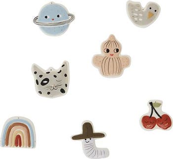 Use these cute and fine porcelain figures as a hanging in the children's room, which at the same time initiates lively and fantastic stories. The figures are a decorative element in the children's room, and have glaze in beautiful colors. Comes in a set of 7 different characters; the bird Billy, the angel Lucia, the planet Pluto, the cat Zorro, the caterpillar Buster, a cherry and a rainbow. Cord for hanging is included.