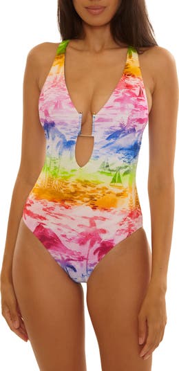Golden hardware shines at the plunge neckline of this striking one-piece swimsuit in a vivid, unmistakable print.